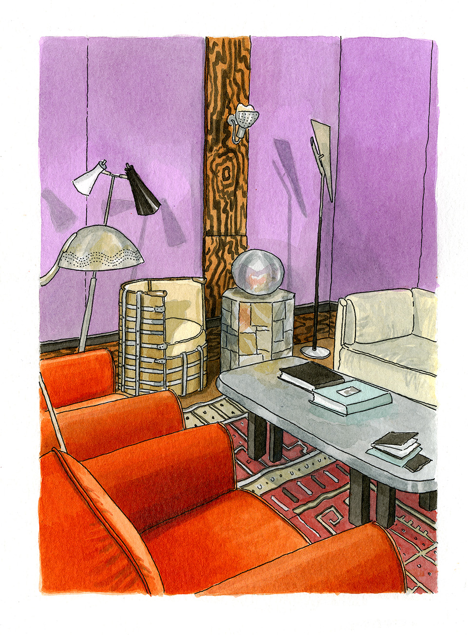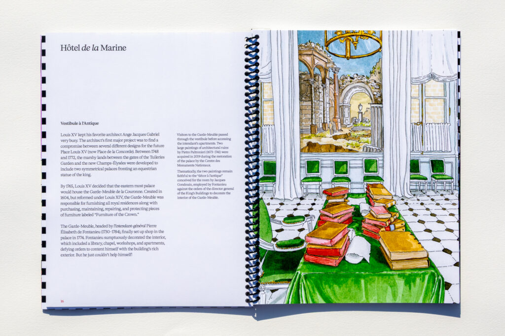 Mise en Scène: Illustrating French Interiors combines paintings of interior spaces across Île-de-France with short writing passages that provide historical context and commentary. The book features ten different locations—from a formal ancien régime palace on the Place de la Concorde to a 1950s home in the western suburbs of Paris. Even across time periods, there is a certain gôut français that inhabits all of these interiors.